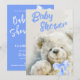 Invite friends and family to celebrate the Mother-To-Be with this Baby Shower Invitation designed with a cute baby bear with a blue ribbon on the front and the text: Baby Shower in blue. The reverse side is decorated with a watercolor blue ribbon with white text on a matching blue background. The reverse text includes: Please Join Us For A, Baby Shower, Honoring, The Name, Date, Time, Location Name (venue or residence), Address and RSVP Details. To personalize this invitation, simply insert your event details into our easy template, replacing the sample text.