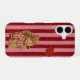 Adorable iPhone case featuring two cuddly teddy bears standing together with matching outfits on a red striped background and a sweet heart detail.