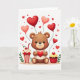 This greeting card features a cute, chubby teddy bear sitting in the center on a plain white background. The bear has soft brown fur, wide innocent eyes, and lightly pink cheeks, and it holds a bright red heart close to its chest ❤️. Above the bear, a bunch of heart-shaped balloons float upward, ranging from deep red to light pink, each tied with a thin green string. Small red hearts are scattered around the balloons to keep the love theme going. On the left side, there’s a red-and-white striped milkshake cup with a little bow, topped with whipped cream, a cherry, and a straw, like a sweet treat for two 💌. On the right side, a cupcake sits in a red wrapper with golden frosting and a tiny red heart on top, with a few small green leaves nearby for a simple frame 🍫. There’s no text printed on the front, so the picture does all the talking. Hope it helps you share kind Valentine’s Day feelings with someone you care about.