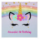 Bring a touch of magic to your party decor with this adorable Unicorn Face Birthday Poster! This eye-catching design features a sweet unicorn face with fluttering eyelashes, a sparkling gold horn, and a whimsical floral crown in bright pink, purple, and mint. Set against a soft purple background with a pastel rainbow arch and gold confetti, this poster is a perfect decorative element for your child's milestone celebration. Easily customize the name and age (like 'Amanda's 1st Birthday' shown here) to make it uniquely yours.