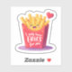 A cute and colorful cartoon illustration of a red French fries carton with a happy kawaii smiling face. The design features a floating red heart and the romantic funny pun quote "I only have FRIES for you". The image has a white sticker border, making it perfect for Valentine's Day greeting cards, fast food lovers, and humorous romantic gifts. Isolated design.