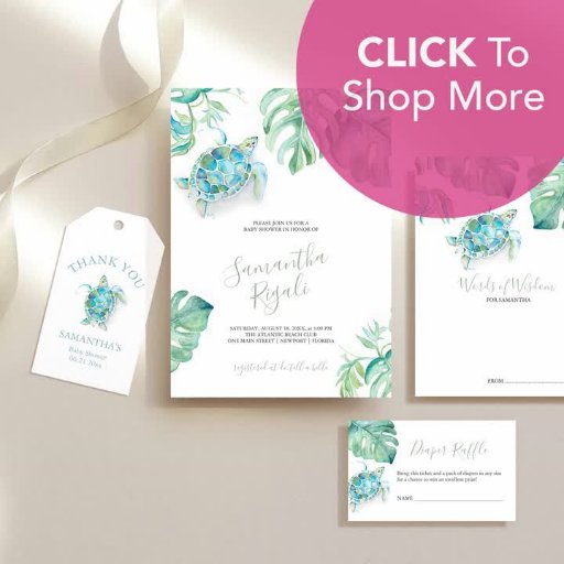 Add cute tropical flare to your baby shower with this island chic seal. The design feature original watercolor sea turtle and monstera palm leaf art by Victoria Grigaliunas in shades of turquoise, blues and greens. Personalize with the names and shower date. Edit the words to read Thank You and use as favor stickers. To see the matching baby shower suite visit www.zazzle.com/dotellabelle