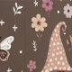 A cottage core folk art style wall paper with cute little fairy gnomes, mushrooms, flowers in mauve, brown and burgundy.