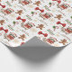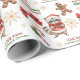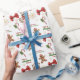 The repeated pattern on this Christmas wrapping paper includes an image of a cute woodland raccoon wearing a winter sweater and a hat. Also included in the pattern is a gingerbread man, a red bow, a candy cane with holly, and varied sizes of ornate gold snowflakes. Stylized red and green text says MERRY CHRISTMAS" with a text field for your child's name. Another text field is for your custom signature.