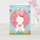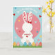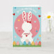 This card shows a stylized white bunny with long ears centered on the page, wearing a small red bow that hints at a sweet, close bond 🐰. Inside the ears, red polka dots sit on a soft pink base, adding a cozy, affectionate detail that feels like a shy blush. Behind the bunny is a large coral-pink circle set against a light blue sky, creating a calm springtime setting. Small hearts in red, pale pink, yellow, and aqua float across both the blue and coral areas, like little notes drifting between friends 🌷. Along the bottom, a strip of green grass holds eight decorated egg shapes in mixed patterns such as stripes, dots, and zigzags in pastel shades. Curving across the top, the main message “You’re the cutest little bunny!” appears in a dark, flowing handwritten style, easy to spot against the sky. On the bunny’s body, the smaller word “mommy’s” is placed with a tiny red heart right beside it. Soft shadows sit under the bunny, hearts, and eggs, giving the flat shapes a gentle lift from the background.