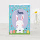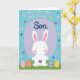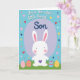 This card features a stylized white bunny centered inside a large lavender oval, with soft pink inside its tall ears, tiny dot eyes, and rosy cheek marks that give it a tender, affectionate look 🐰. A deep purple heart sits on the bunny’s chest, suggesting closeness and care through the imagery rather than extra wording. Near the top, “Son” appears in dark blue lettering, placed above the oval like a gentle dedication. Above that, a white message reads, “You’re the cutest little bunny!”, set in flowing lettering across the upper area. The background is bright turquoise, like a clear spring sky, sprinkled with small hearts in pink, red, yellow, and deep blue, along with a few round accents that add a light, friendly rhythm. Along the bottom edge, a strip of green grass grounds the scene, and four decorated eggs with stripes and dots peek up as if waiting to be found 🌷. The eggs sit in the grass beneath the bunny, each with its own pattern and color arrangement.