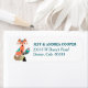 Ein bunter, niedlicher Fuchs trägt ein Stammestanzkleid im Boho-Stil und trägt eine Musterfeder. Das orange und türkisfarbene Bild wird auf einem weißen Hintergrund platziert, auf dem rechts Ihr Name und Ihre Adresse in dunkel aquamarin sind.