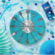 Zeit zum Essen! Blau und Aqua-Uhr-Gesicht aus Löffeln und Gabel. Wie toll ist das für einen phantastischen Teller! Sehen Sie, es ist ein rosa und rosa Schwesterbild 'Cutlery O'clock 2'.