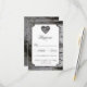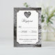 Cutout Heart Birch Tree Bark Wedding RSVP Cards - mit einem weißen Textfeld über einem Hintergrund einer Birkenbaum Rinde. Auf der Rückseite befindet sich die gleiche Birkenrinde. Die Texte verfügen über eine Mischung aus Schriftzeichen und Standardfarben in Schwarz und Grau.