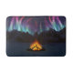 In einem schneebedeckten Tal in einer frostigen Nacht im Winter springt ein Feuer hoch, um die Nordlichter zu spiegeln, die den Himmel über den fernen Bergen füllen.