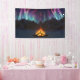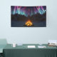 In einem schneebedeckten Tal in einer frostigen Nacht im Winter springt ein Feuer hoch, um die Nordlichter zu spiegeln, die den Himmel über den fernen Bergen füllen.