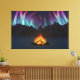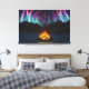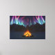 In einem schneebedeckten Tal in einer frostigen Nacht im Winter springt ein Feuer hoch, um die Nordlichter zu spiegeln, die den Himmel über den fernen Bergen füllen.