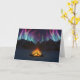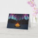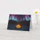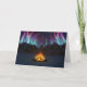 In einem schneebedeckten Tal in einer frostigen Nacht im Winter springt ein Feuer hoch, um die Nordlichter zu spiegeln, die den Himmel über den fernen Bergen füllen.