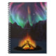 In einem schneebedeckten Tal in einer frostigen Nacht im Winter springt ein Feuer hoch, um die Nordlichter zu spiegeln, die den Himmel über den fernen Bergen füllen.