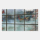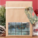 Eine kühle Herbstlandschaft, die durch ein mattiertes Fenster eines Morgens betrachtet wird. Tannen und Kiefern mit eisweißenden Nadeln, Ahorn in Rot-, Orange- und Gelbtönen, frostweißes Gras durch den Nebel aus einem versteckten Bach gesehen. An beiden Seiten des Fensters sind rot-grüne Rose-Blätter angebracht.
