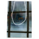Eine kühle Herbstlandschaft, die durch ein mattiertes Fenster eines Morgens betrachtet wird. Tannen und Kiefern mit eisweißenden Nadeln, Ahorn in Rot-, Orange- und Gelbtönen, frostweißes Gras durch den Nebel aus einem versteckten Bach gesehen. An beiden Seiten des Fensters sind rot-grüne Rose-Blätter angebracht.