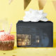 Blick in die Hütte an einem frostigen Winterabend kurz vor Weihnachten. Helle rote Kerzen sind heiß, was ein warmes Glühen über den Schnee aussendet. Der Weihnachtsbaum und der Keller sind mit Krümeln und Goldbällen geschmückt. Eine Kalickatze blickt aus dem Fenster auf eine Kichermücke, die draußen auf der Bügel sitzt, und ein Paar Füchse schielen um die Ecke des kleinen Hauses.