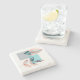 Modernes Design mit Quadraten und Blätter in kontrastierenden Zyantönen, Rot und Orange.