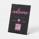 Erleben Sie einen unvergesslichen Eindruck mit unserem Cyber-Glühen Neon Pink Welcome WIFI QR Code Pedestal Sign. Dieses cyber-schicke Design besticht durch ein elegantes Willkommensskript in leuchtendem Neon-Rosa und ein WLAN-Logo vor einem schwarzen Hintergrund. Die Netzwerkinformationen inklusive Passwort sind großzügig und beruflich gestaltet.
