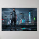 Ein atemberaubendes, fotorealistisches Bild einer cybernetisch verbesserten Person, die auf einem Dach stehend ist, mit einer sich ausbreitenden neonbeleuchteten Cyberpunk-Stadt im Hintergrund. Das Design hebt die detaillierten mechanischen Gliedmaßen und die elegante High-Tech-Kleidung hervor und schafft ein leistungsstarkes und futuristisches Portrait, das perfekt für Fans von Science-Fiction und Cyberpunk geeignet ist.
