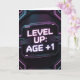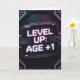A futuristic, high-tech birthday card design inspired by Cyberpunk aesthetics. Featuring neon purple and electric blue glowing typography on a dark carbon fiber background. The design looks like a holographic interface with digital glitch effects and the text "LEVEL UP: AGE +1".