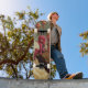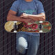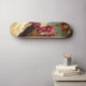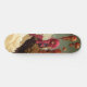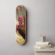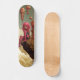 Skateboard illustriert die Situation von a pink-haired girl is sitting on the edge of an old, rusty floating island in space with many clouds and houses hanging from it. She is wearing a blue bodysuit with red details and shoes. Die Sky above her head has many flying lanterns. The art is in the style of digital art.