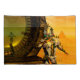 Künstlerisches und helles Science Fiction Bild in Gelb, Grün, Braun, Weiß. Titan cyborg von Hyperion mit seinem lebhaften, reflektierenden Chromkarosseriebild in einer surrealen Umgebung mit Pyramiden, heiße Sonne, Wüste ähnlich einer ägyptischen Landschaft, Animationsrahmen aus dem 3D-Film Hyperion World .Baldesign3d (c)