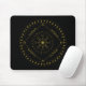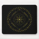 Cycles classic mouse pad. Cycles is a Germanic design created by Anna M. Asbury and consists of a black background with an Aegishjalmr in the center and encircled by Elder Futhark Runes. The design is enclosed in a diamond with the Ingwaz Rune, flanked on all four sides with a bind rune, and encircled by the Jera and Ingwaz Runes.