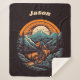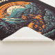 Radfahren, Retromalerei in Orange und Blau eines Radfahrers, der durch die Berge und den Wald mit der Sonne im Hintergrund reitet