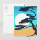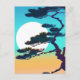Postkarte in einer inspirierten japanischen Silhouette eines Zypressenbaumes, der einen Vollmond umrahmt, gegen einen Orangenhimmel aus Aqua und Korallen