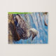 Ein Foto einer weiblichen Mallard-Ente, die im flachen Bereich eines Teiches stehend ist, wobei sich Wasserarme in kreisförmiger Bewegung von ihr wegbewegen. Copyright Kimberly J Tilley.