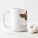 Diese lustige Weihnachtsfeier ist mit einer illustrierten Dackel in einer Weihnachtsmannmütze "Dackel durch den Schnee" in Rot unter. Sie können Wörter auf der Tasse anpassen, wenn Sie es vorziehen.