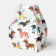 Niedliche Geburtstag Party Dackel Hunde mit Schwarz, Bräune und Apfelmäntel gekleidet in niedliche Geburtstag Outfits mit Ballons, Kuchen und Konfetti Muster.