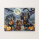 Entfesseln Sie den unheimlichen Geist mit diesem unheimlichen Halloween-Design, das eine Hundepackung unter einem dunklen, mondbeleuchteten Himmel bietet, umgeben von fliegenden Fledermäusen und glühenden Kürbissen. Ideal für diejenigen, die mit ihren wütenden Freunden eine Touch voller Furcht Liebe haben!