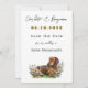 Save the Date Vorlage mit Dackel Hund Design. Wildblumen und ein braunes Dackel-Bild ganz unten. Passen Sie Ihre Hochzeitsfeier mit fünf Zeilen Text in Script und gedruckten Schriftart in schwarz und braun grün an. Ändern Sie einfach die Textfarbe im Designwerkzeug oder frag mir um Hilfe.
