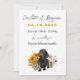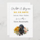 Save the Date Hochzeitsankündigung Vorlage mit Dackel Hund Design. Passen Sie Ihre Hochzeitsfeier mit fünf Textzeilen in Script und gedruckten Schriftart in Schwarz und Gelb an. Vornamen oben mit groben Zahlen für das Datum, in gelber goldfarbener Farbe. Ein niedlicher schwarzer Hund steht unter Sonnenblumen und Wildblumen im Design unten. Ideal für eine Hochzeit im Frühling oder Sommer. Ändern Sie einfach die Textfarbe im Designwerkzeug oder frag mir um Hilfe.
