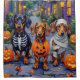 Adorable Dackeln, die in lustigen Halloween-Kostümen gekleidet sind, tragen Kürbiseimer, während sie unter dem Mondlicht trick oder behandeln. Dieses festliche Design hebt den langen Körper der Rasse, den spielerischen Geist und die treue Natur hervor, die perfekt die spukhafte und doch fröhliche Atmosphäre der Halloween-Nacht einfangen. Eine wunderbare Feier für Hundefreunde und Halloween-Fans gleichermaßen.