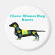 Ich Liebe Dackel Hunde Rennen in fett aquamarinen Text über dem grafischen Kunstwerk einer schwarzen whimsical Dackel mit bemalter Blume, mit seiner Rennnummer auf dem Rücken und Tennisschuhe auf. Ein Geschenk für jeden Liebhaber der Dackel.