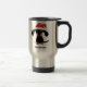 Wiener Dog Christmas Travel Mug. Funny art illustration of a black and tan Dachshund wearing a Santa hat. A fun to-go mug for anyone who loves a Doxie. "Ho Ho Ho" text can be customized. Visit Jenn’s Doodle World for even more products featuring this original weenie dog design. ©Jenn Inashvili