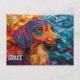 Das ist ein abstraktes, farbiges Hundeportrait einer Dackel, die einen Hund in Papierquilling Art züchtet. Es ist eine schöne Postkarte für Hundefreunde und Dackeln.
