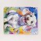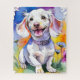 Ein digitales Kunstbild eines fröhlichen Dackel-Hundes mit Floppy-Ohren und Kragen sitzt unter den Blume und strahlt vor einem lebendigen Splash-Hintergrund Freude aus. Die Farben wechseln zwischen Blues, Purpur, Orangen und Gelb und geben der Szene eine lebendige und skurrile Atmosphäre.