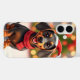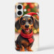 Dackel im Stil eines Cartoon trägt eine festliche rote Weihnachtsmannmütze und einen roten Schal. Der Hund hat glänzende, große Augen und einen breiten, lächelnden Mund, was ihm ein freundliches Aussehen verleiht.