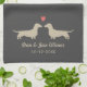 Kurzhaarige Dackel-Silhouetten, die mit Herz-und Gewohnheits-Text sich gegenüberstellen. Personifizieren Sie dieses kundenspezifisch anfertigen mit Namen der Braut und des Bräutigams, des wedding Datums oder Ihrer besten Wünsche für das glückliche Paar. Macht ein großes Geschenk für Brautpartys, Hochzeiten und Meilensteinjahrestage. Ein dekoratives Küchentuch für Dackelhundeliebhaber. Besuch Jenns Gekritzel-Welt für sogar noch mehr Dackelentwürfe und tierische themed Gastgeschenke Hochzeit und Geschenke.