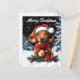 Mit dieser Weihnachtspostkarte der festlichen Dackel mit einer bezaubernden Dackel senden Sie fröhliche Urlaubswünsche. Die Dackel trägt eine Weihnachtsmannmütze und sitzt inmitten von Weihnachtsschmuck und Ästen, mit schneebedeckten Bäumen im Hintergrund einer Winterlandschaft. Schneeflocken fallen sanft gegen einen Sternenhimmel, was dem gemütlichen Ambiente eine Touch Magie verleiht. Mit den Worten "Frohe Weihnachten" ist diese Dackel Weihnachtspostkarte der perfekte Weg, um Wärme und Fröhlichkeit mit Lieben und Dackeln Liebhabern während der Ferienzeit zu teilen.