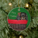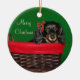 Schwarz-bräunliche Miniatur lange Haare (wenn auch leicht gekürzt) Dackel sitzt in einem Urlaubskorb und wünscht frohe Weihnachten in wechselbaren oder abnehmbaren Text-Hund-Liebhaber Schmuck