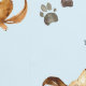 Dackel-Welpen mit Tennisball, Pfotenabdruck, Knochen und Hummel auf pastellblauem Hintergrund ©OctopusArts & DecampStudios