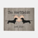 Dackel themed Tür Matte in einem rustikalen Holzbrett-Look, mit niedlichen Grafiken von zwei schwarzen Dackel Silhouetten gegen ein Land polka Punkt Herz getan. Personalisieren Sie den schwarzen Text nach Ihren Wünschen.