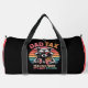 This black duffle bag features a humorous graphic of a cool raccoon wearing sunglasses and holding a soda and fries, against a retro sunset. "DAD TAX" is written in pink and orange above, and "MAKING SURE IT'S NOT POISON" is below, humorously depicting a dad's "tax" on his kids' snacks. This design is perfect for dads with a playful sense of humor. Edit color of the bag caps and body in the Design tool to your favored colors.