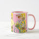 Handgemalte, gelb rosafarbene, blumenreiche Tasse mit einem vollständig anpassbaren Damennamen. Ein wunderschönes Blumendesign in Aquarelltönen. Entworfen aus meinen ursprünglichen Aquarellbildern, die ich aus meinem eigenen Blumengarten gemalt habe.