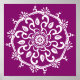 Dieses weiße Mandala sitzt auf einem lila, warmen Hintergrund. Die Farbe ist luxuriös und kreativ. Teil der Payon Mandala Kollektion.